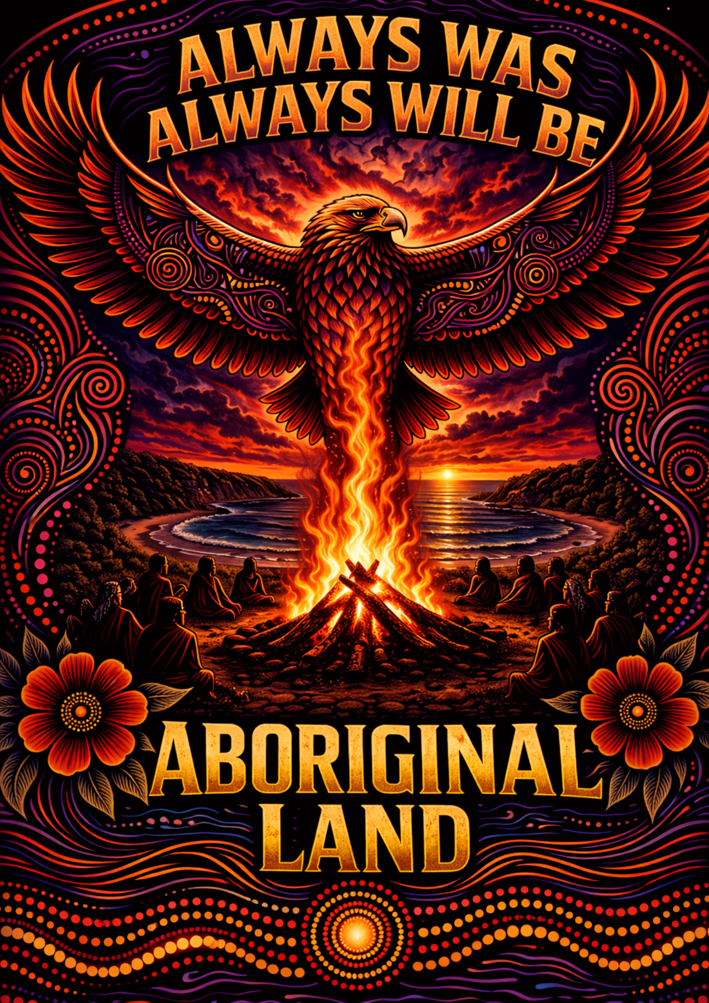 This piece speaks from fire, sky, water, and spirit. It carries the strength of Country, the presence of Bunjil, and the ongoing truth that Aboriginal land, culture, and story have always been here and always will be.