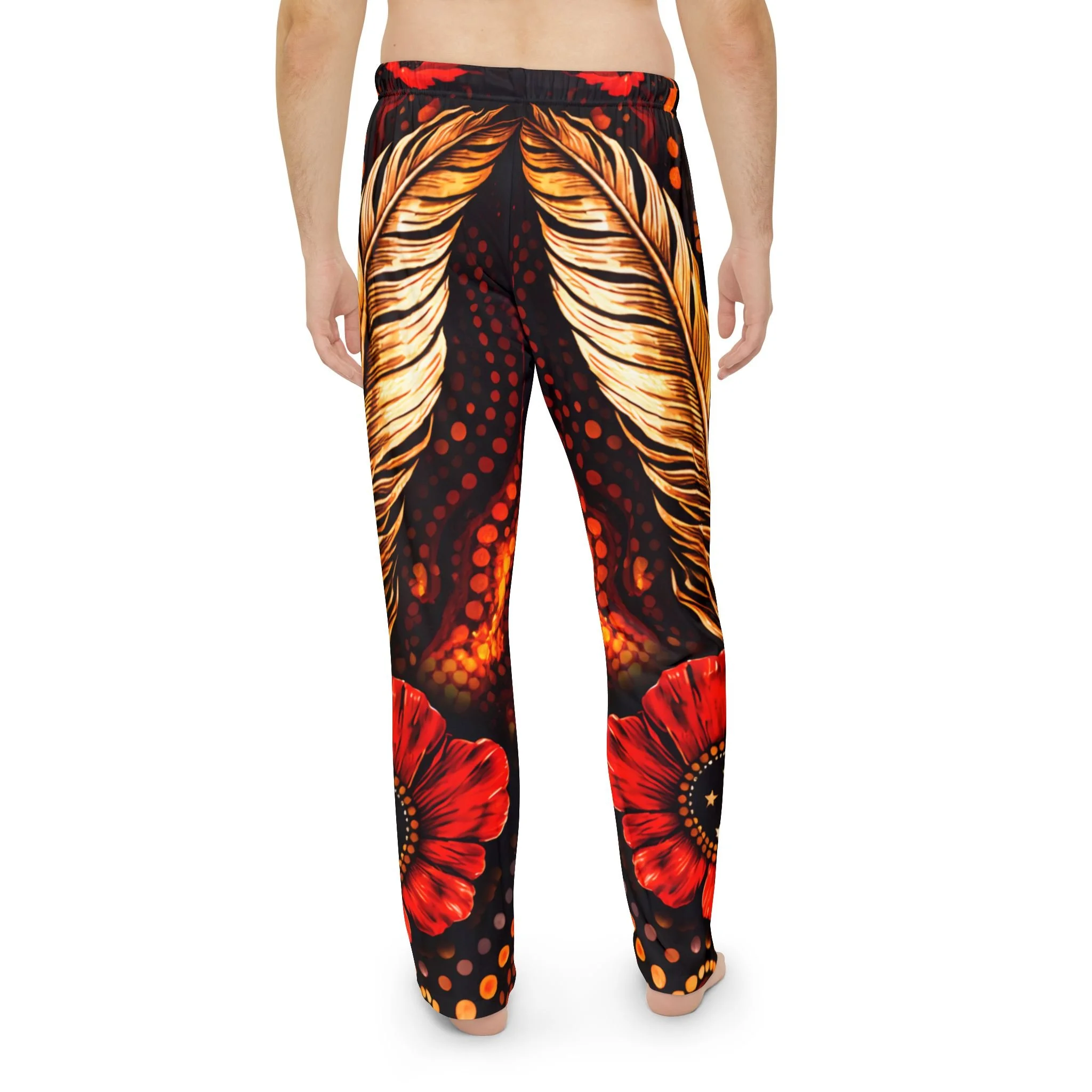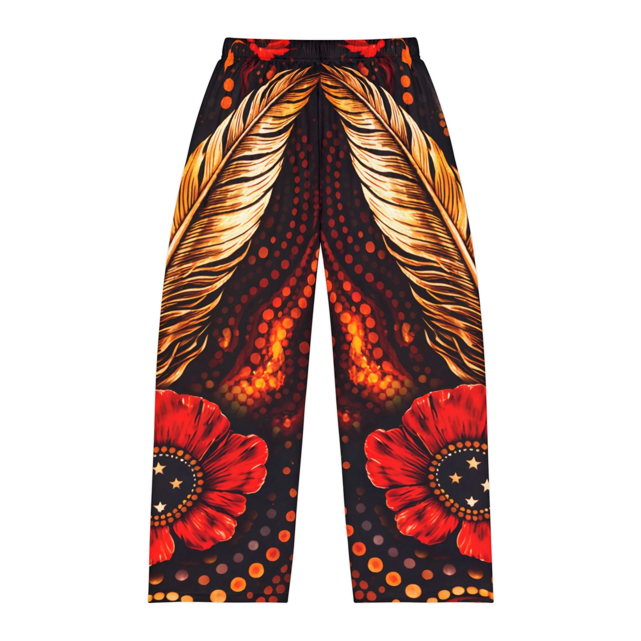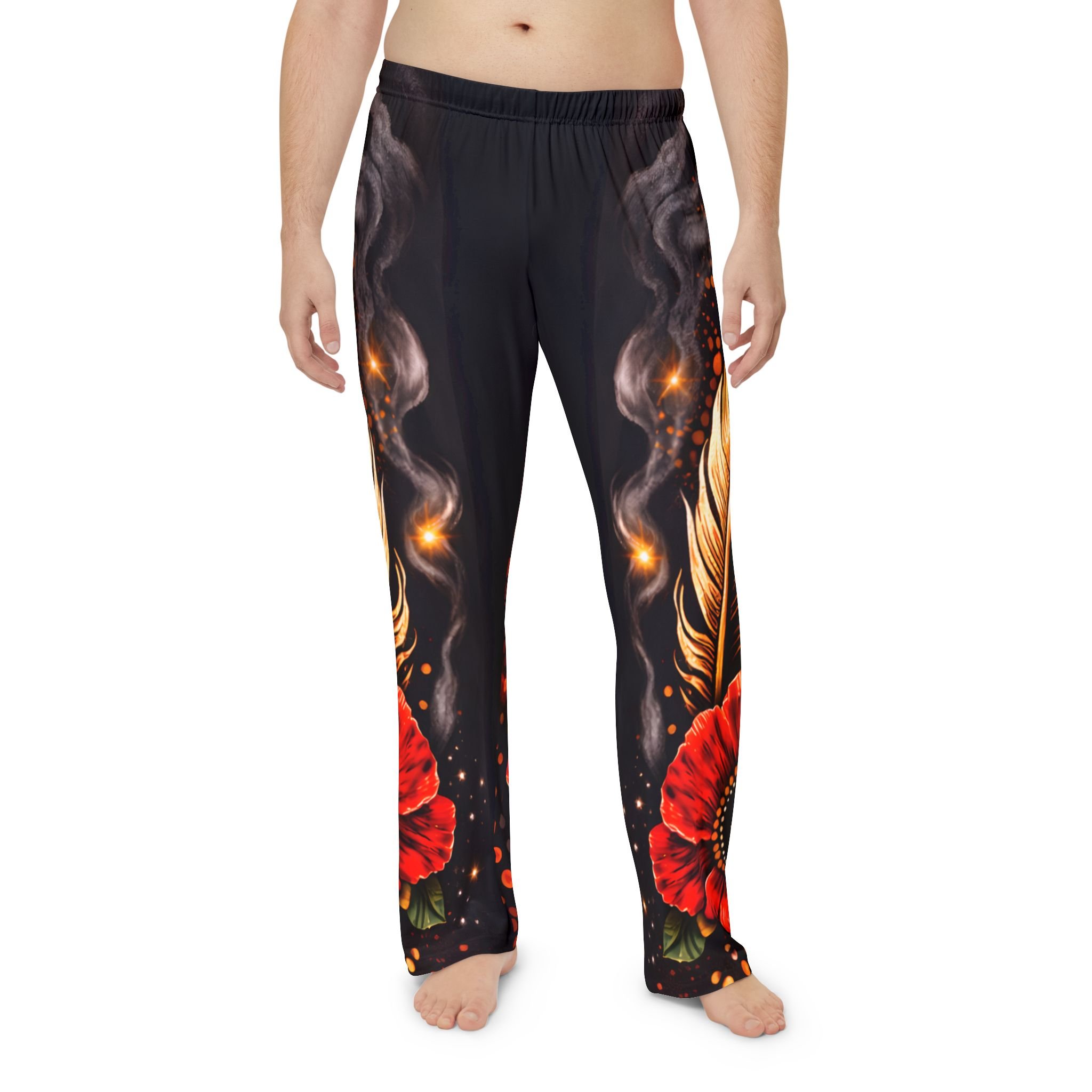 These pajama pants bring bold, painterly energy to quiet mornings and late-night lounging. The rich, dark background makes warm gold feathers and crimson poppies glow like candlelight, while subtle ember-like dots add movement across the legs. Lightweight and soft against skin, they move with you—stretching at the waist, folding at the knee, or draping across the couch—so the artwork reads whether you’re stretched out or curled up. Wear them for slow weekend rituals, creative nights in, or when you want sleepwear that feels like an expression of your personal style.