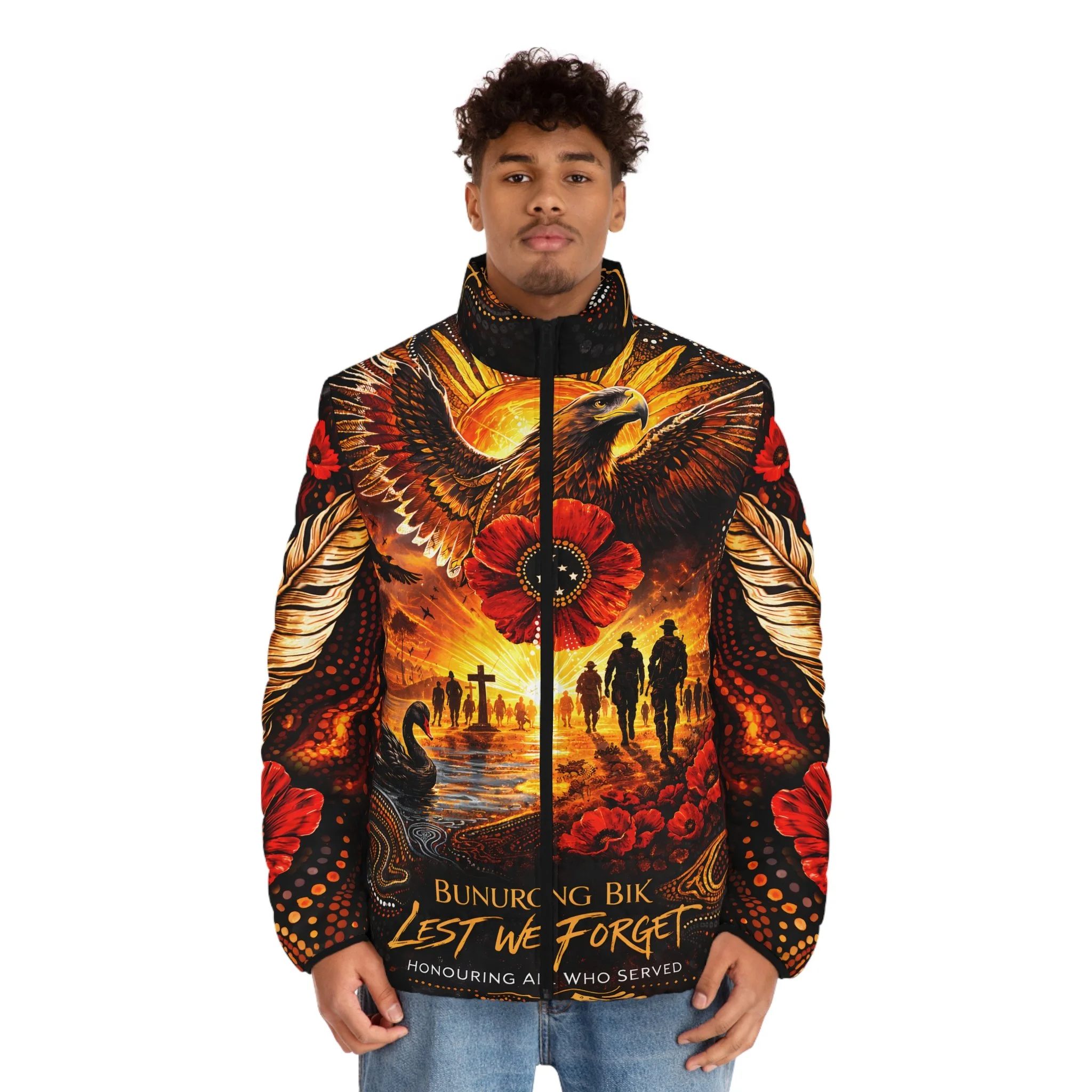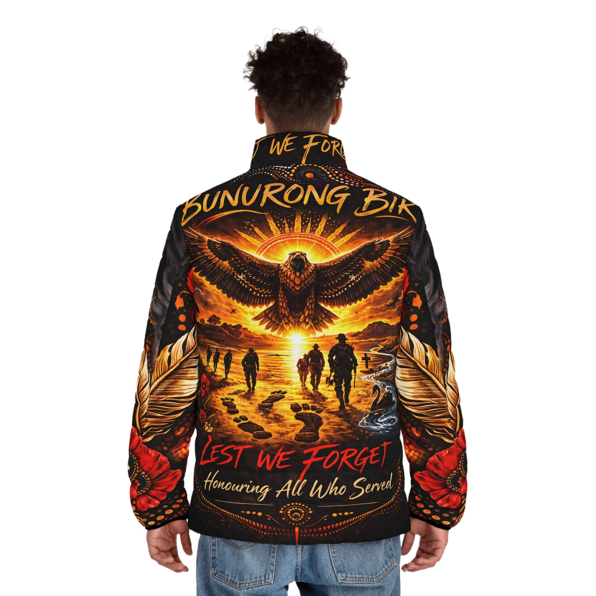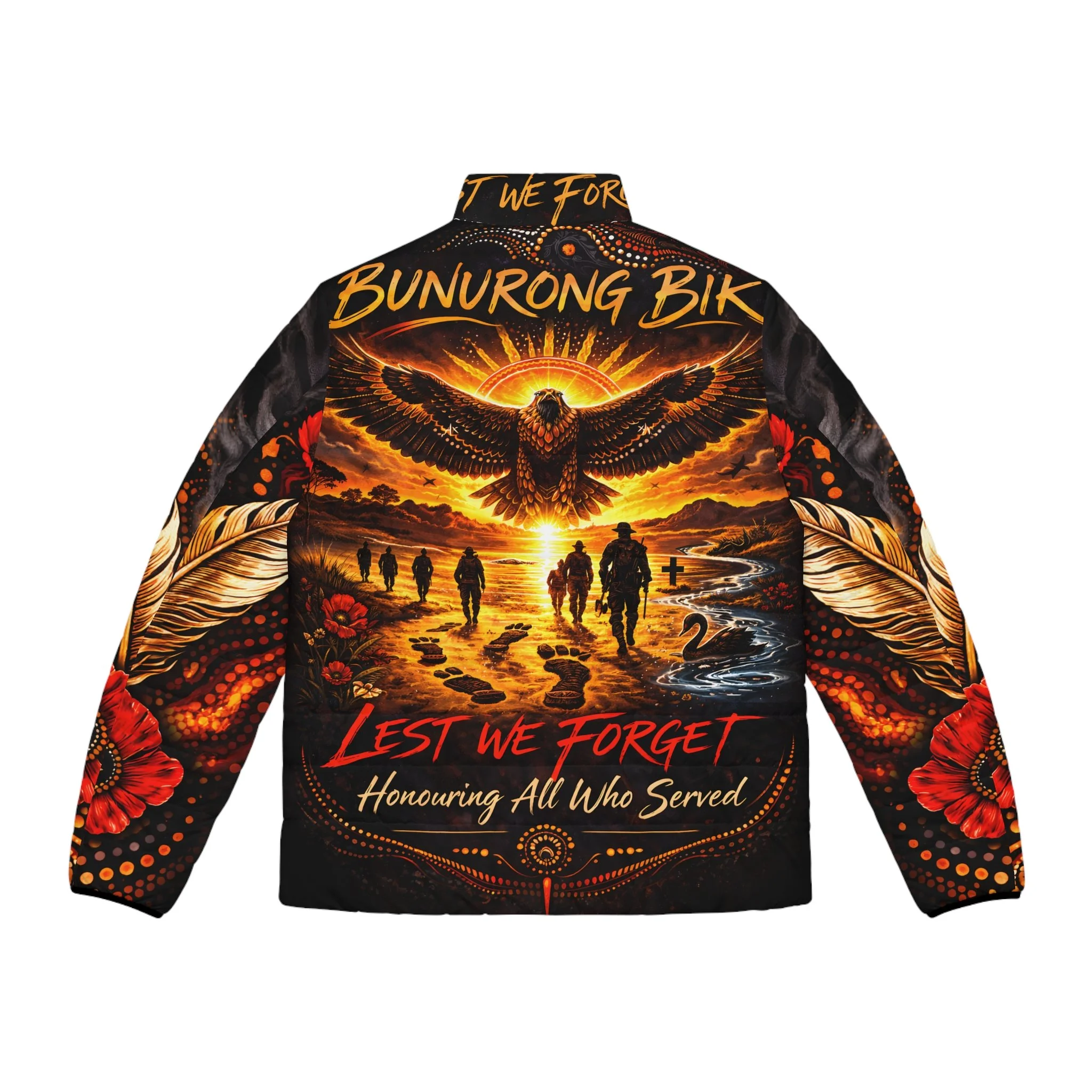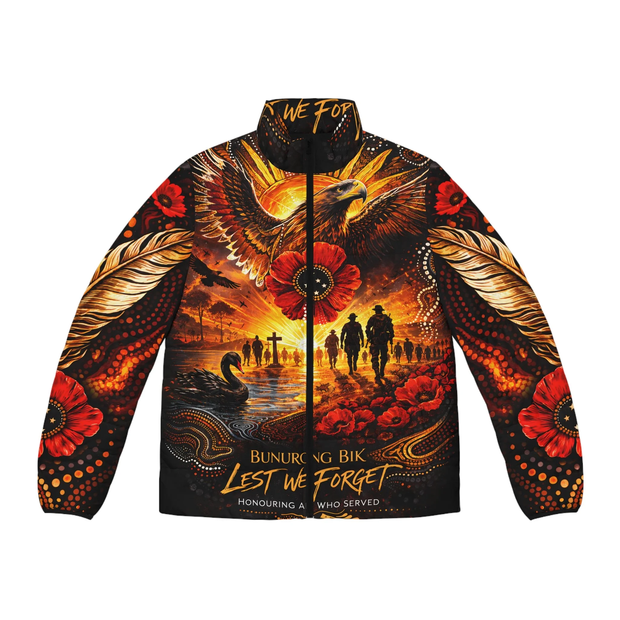 Warmth and meaning combined in a statement puffer that honours service and memory. Deep, sunset-hued artwork wraps the jacket — an eagle rising over silhouetted figures walking toward a shoreline scattered with poppies and quiet memorial crosses. The colours are rich, the quilting soft, and the stand-up collar keeps wind at bay while the bold artwork reads clearly from front and back. Wear it to remember, to reflect, or to show silent solidarity with veterans and First Nations communities; the imagery feels both ceremonial and personal, an outer layer that carries a story wherever you go.