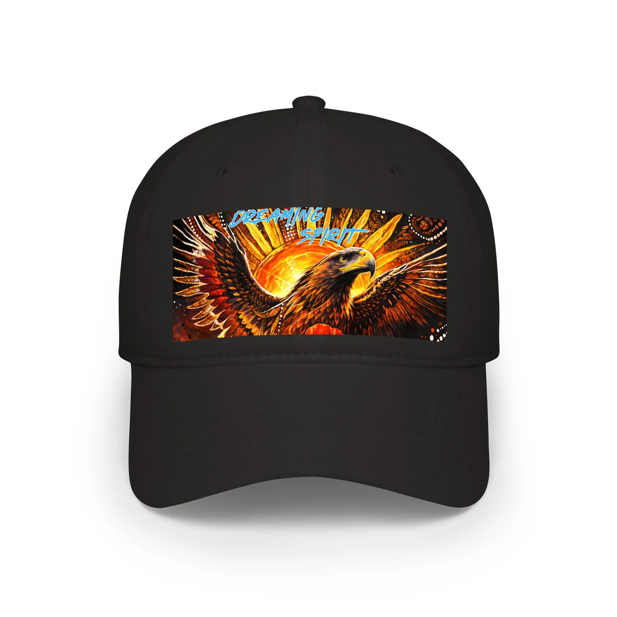 Bunjil — the wedge-tailed eagle — spreads across the front in bold, sculpted linework that feels ancient and alive. This low-profile baseball cap settles low on the brow, framing your face while the embroidered eagle emblem catches light and attention. It fits into days spent outdoors tracking ridgelines, long drives across red earth, or quiet moments on a back porch at dusk. Wear it when you want a quiet nod to country sky and ancestral stories. The cotton twill and reinforced seams give it a lived-in strength; the adjustable Velcro® lets you tune the fit as the day shifts. It ages with you, collecting sun and stories without losing its character.