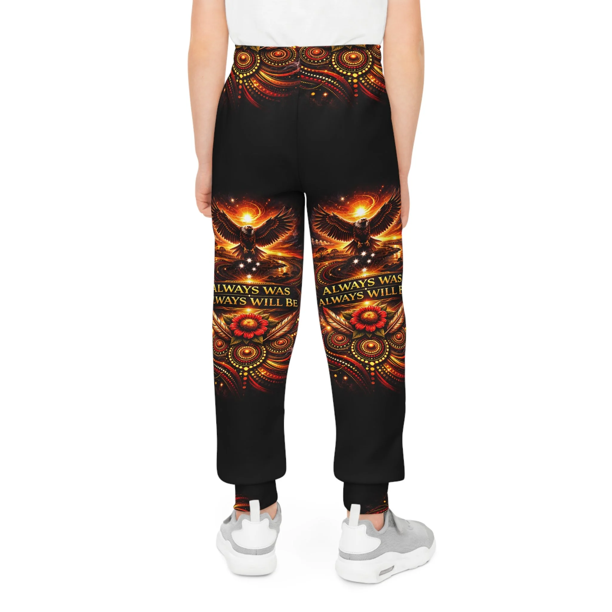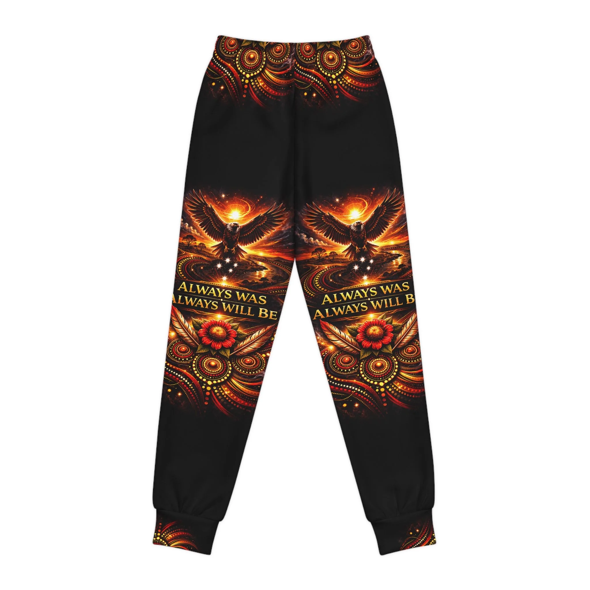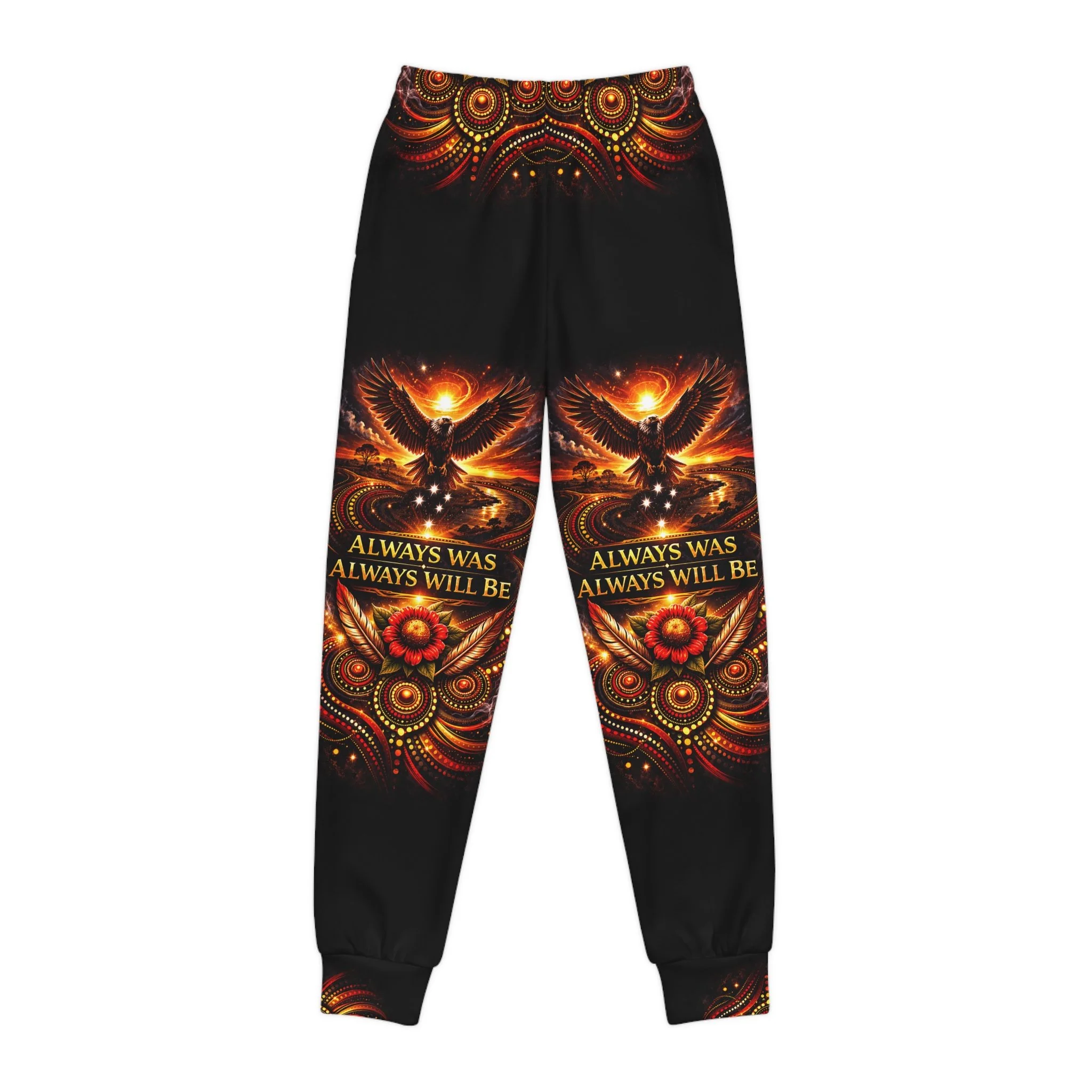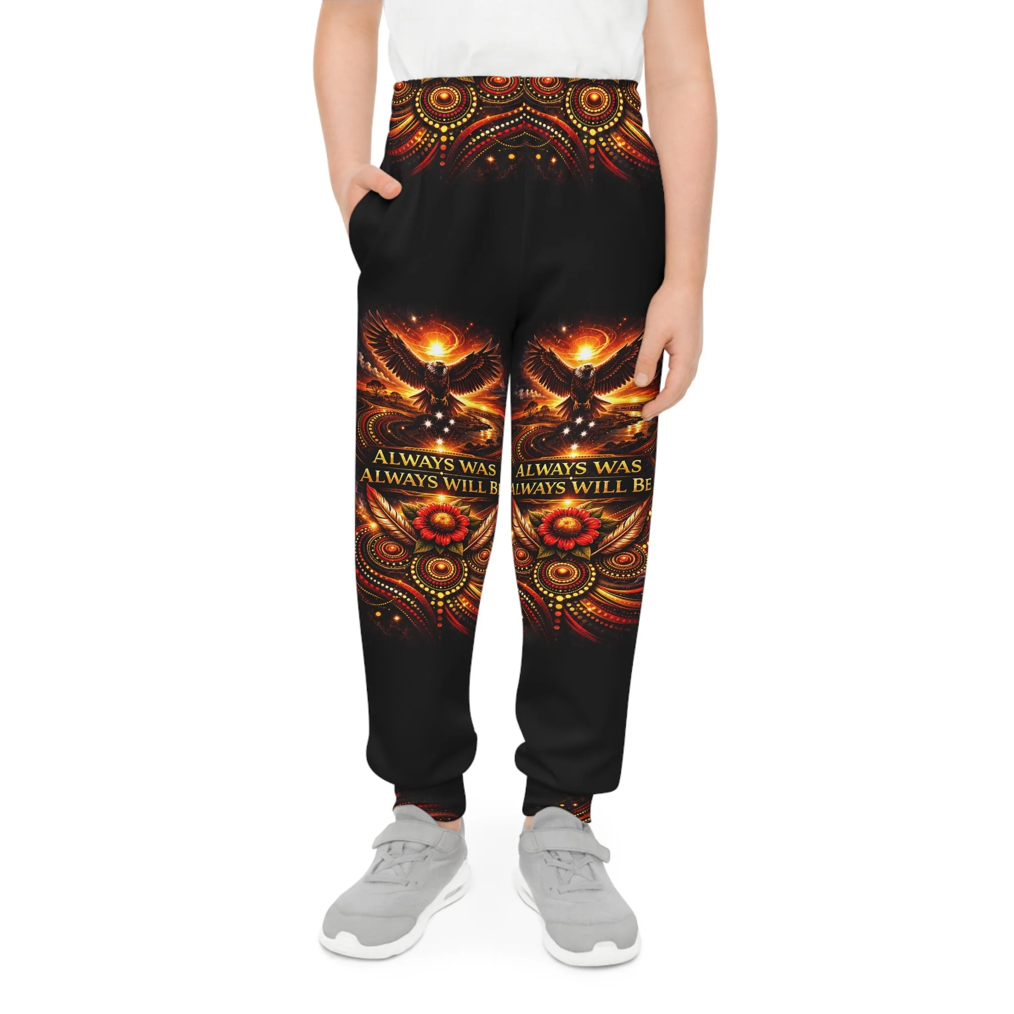 These youth joggers wear a message. The fabric carries the words “Always Was, Always Will Be — Aboriginal Land,” so every step feels like acknowledgement and respect. Soft, slightly stretchy knit moves with young bodies — running, climbing, sitting by a fire — without fuss. Side pockets hold a small treasure or snack. A gentle, elastic waistband stays comfortable all day and adapts as kids grow. Let them play while the design quietly holds space for history and connection.